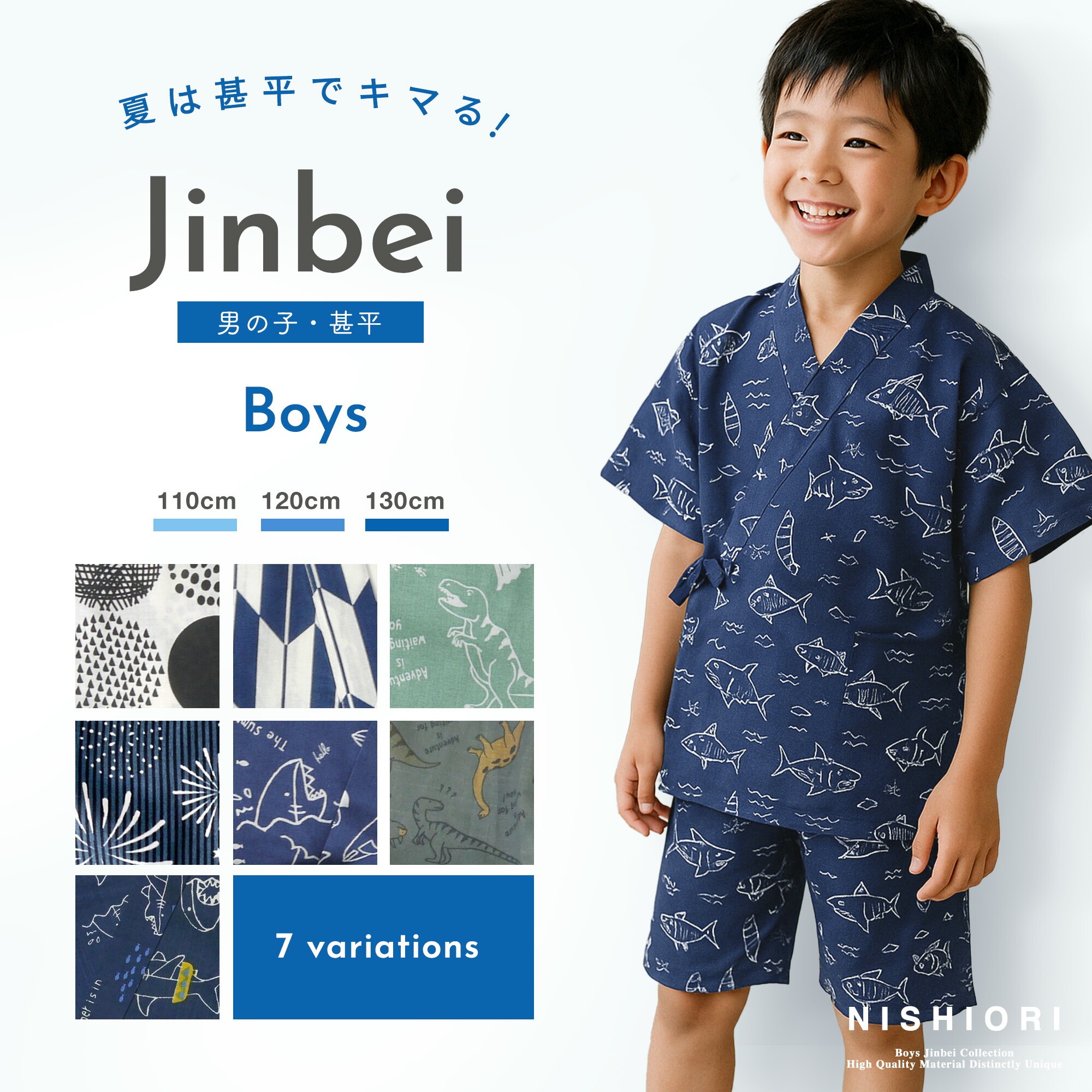 男児 甚平 選べる 7柄 3サイズ 110cm・120cm・130cm 2才/3才/4才/5 恐竜 サメ ドット アニマル柄 古典柄 矢羽 紺 濃紺 青 緑 セパレート 綿100%