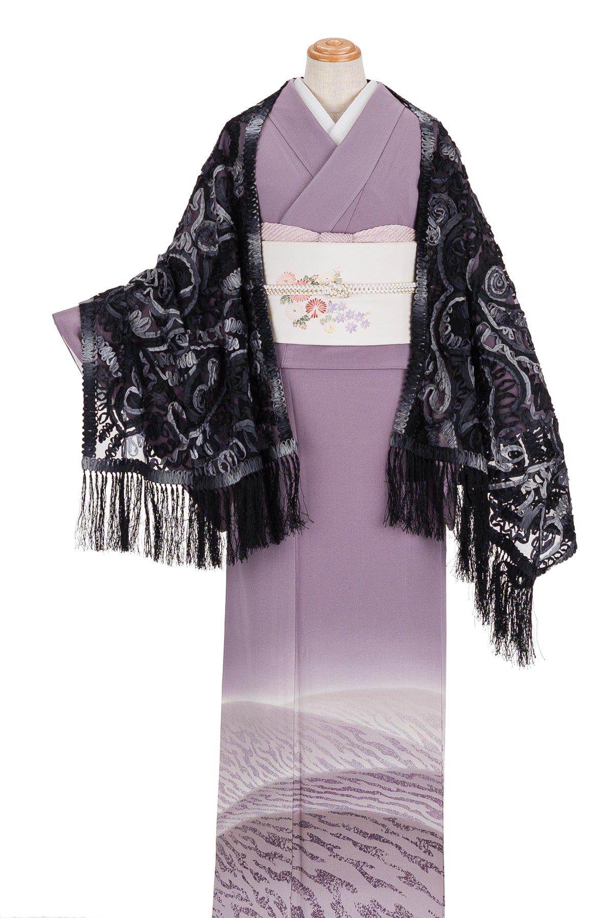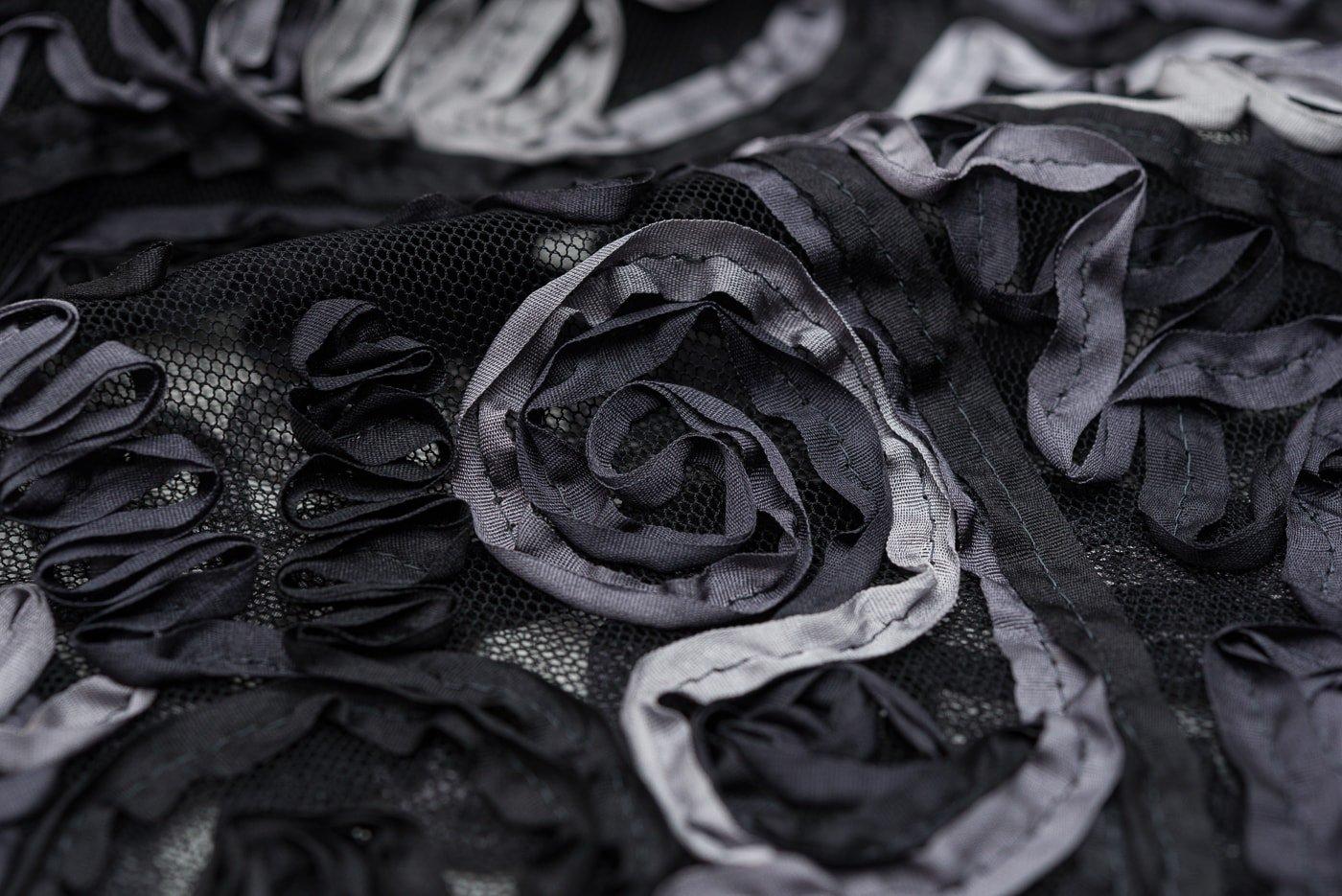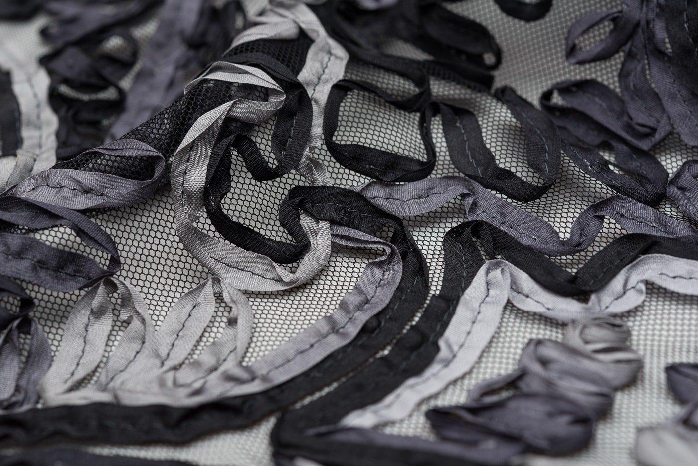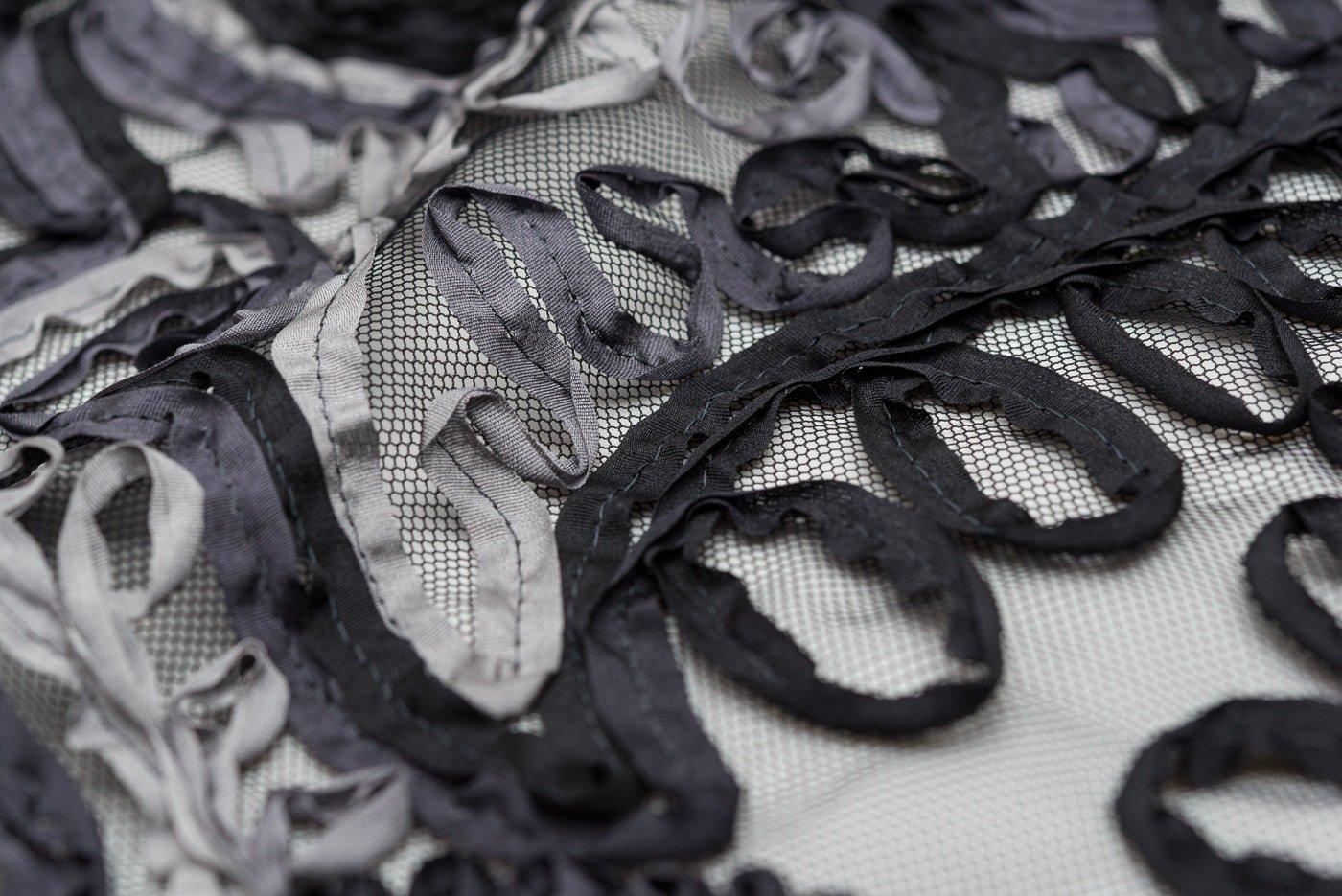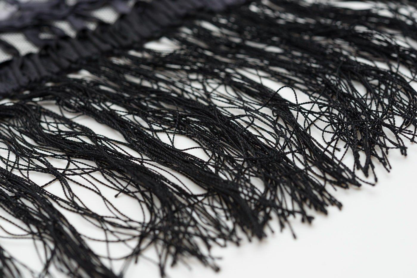黒いチュールレースにモノトーンのリボン刺繍をのせたショールです。