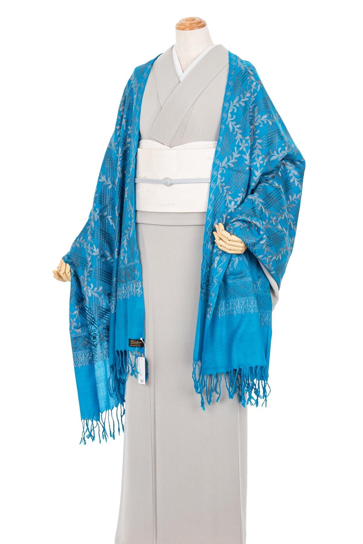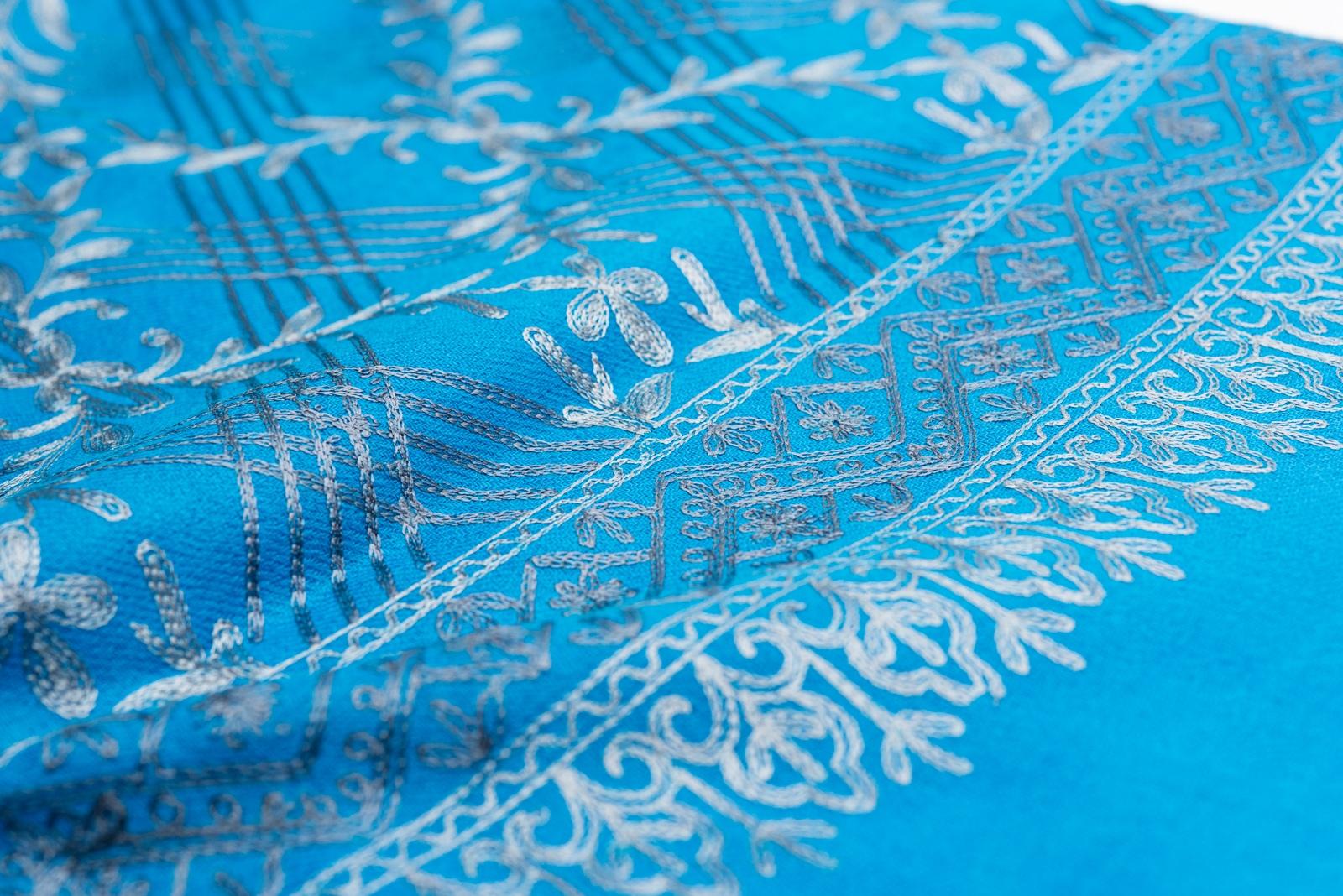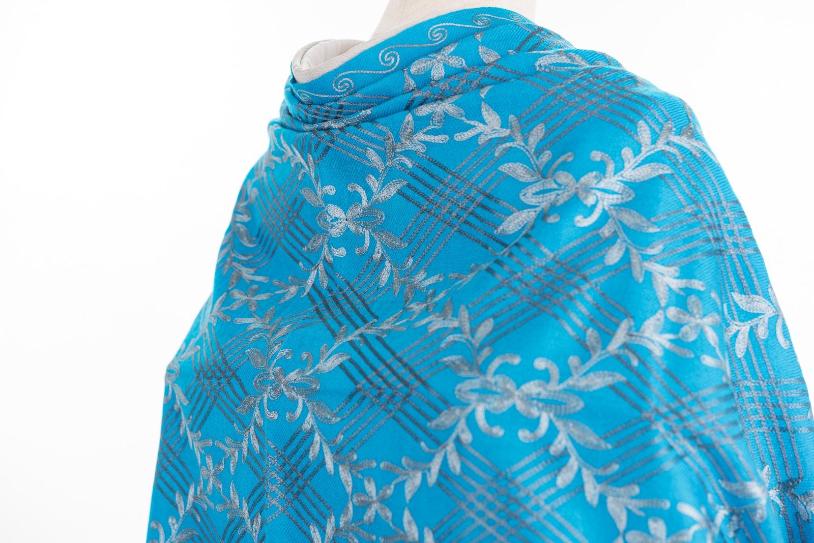ウール100%大判ショール カシミール刺繍 ターコイズ