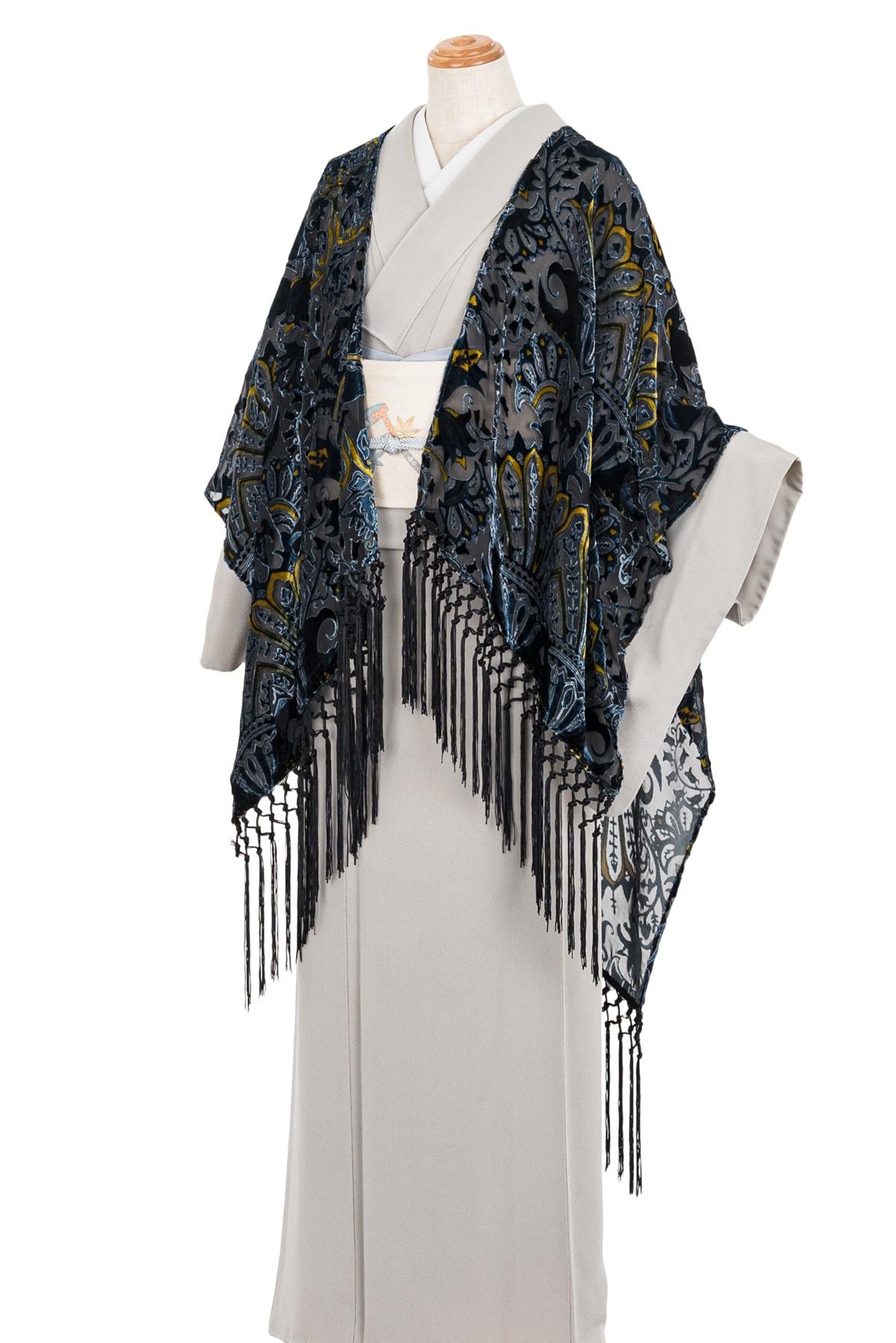 新品 岡重 シルクベルベットショール ネイビー