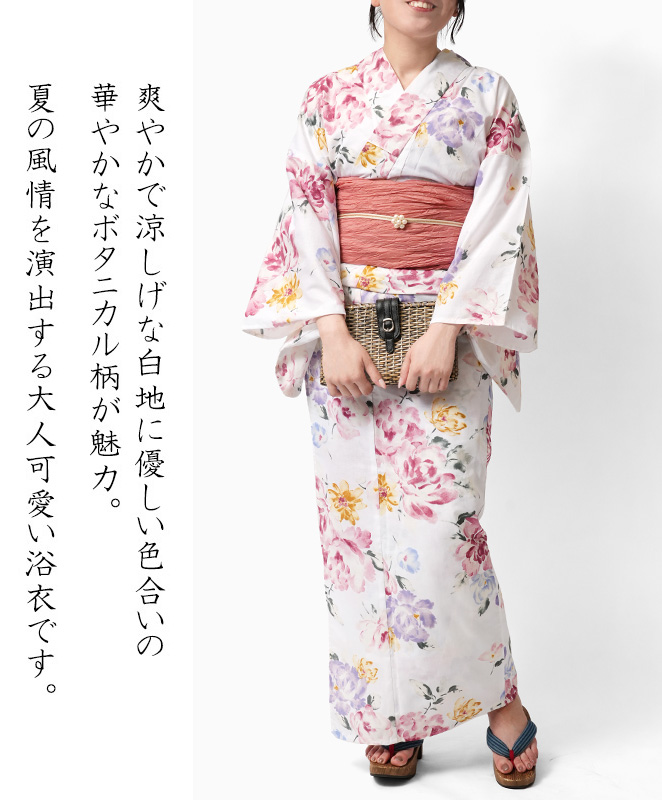 | カジュアル着物専門店が選んだ確かな品質とデザイン。 上品さと可愛さを併せ持つ大人の為の浴衣です。 古き良き和の装いに今のテイストを取り入れた現代感覚のデザイン。 華やかな大人の女性の夏の風情を演出してくれます。 ■生地感について 綿100%なので、天然素材ならではの落ち着いた風合いを持ち、やわらかで優しい肌触り。 ナチュラルで優しい風合いで、肌にはりつきにくく汗ばんでもべた付きにくい、爽やかな着心地です。 丈夫でお手入れがしやすく、ご家庭で丸洗いもOK。 ご着用の際には汗を吸い取り、透けを防ぐ浴衣スリップの着用をおススメします。 ■用途 花火大会やお祭りなど、夏を楽しむイベントにはもちろん、お友達とのお食事やデートなど、様々なシーンに着用できます。 | |