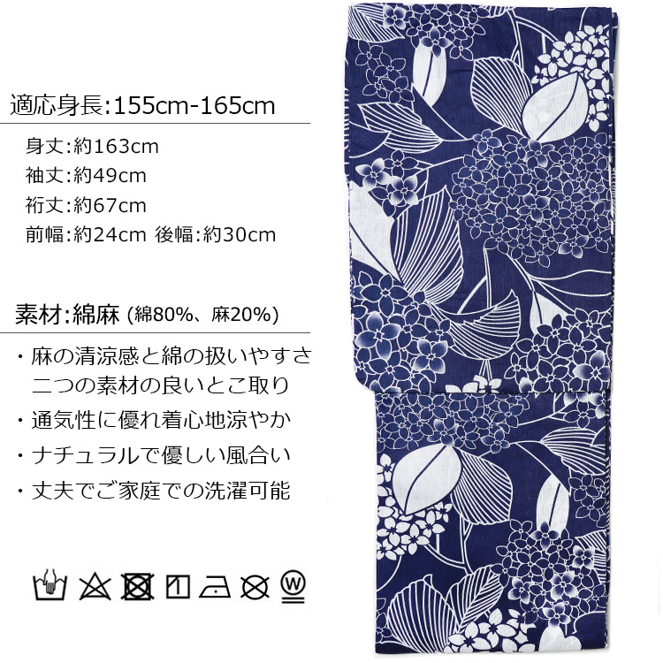 | サイズ | 適応身長:155cm-165cm 身丈:約163cm 袖丈:約49cm 裄丈:約67cm 前幅:約24cm 後幅:約30cm |