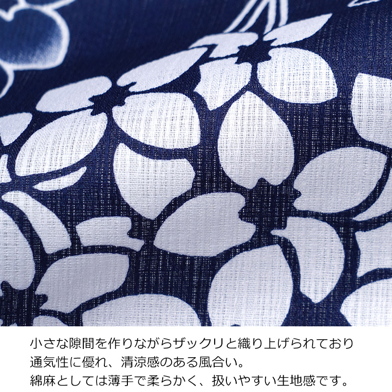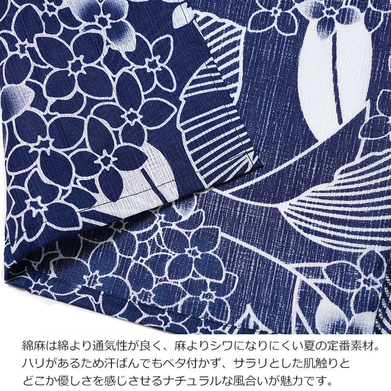 | ■生地感について 綿麻はナチュラルな風合いと鮮やかな発色を合わせ持つ、綿と麻の良い所取りの素材です。 通気性と肌触りが良くお手入れも簡単で、汗をかいても着心地が良く、鮮やかな発色と自然な味わいがお楽しみいただけます。 ■用途 ナチュラルで遊び心を感じさせるデザインは着る人の世代を選ばず、10代、20代、30代、40代の幅広い世代にオススメです。 花火大会やお祭りなど、夏を楽しむイベントにはもちろん、お友達とのお食事やデートなど、様々なシーンに着用できます。 | |