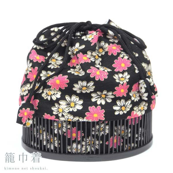 籠巾着(黒×ピンク 白 マーガレット 15137)竹 かご 巾着 カゴバック かご バッグ ゆかたバッグ 浴衣バッグ 卒業式 袴 レディース