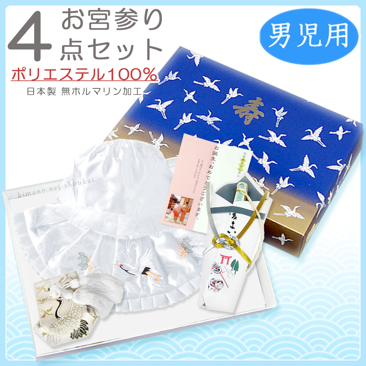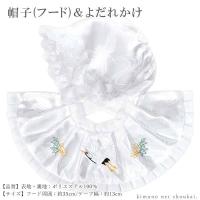 日本製 お宮参り4点セット(ポリエステル/白)男児用フードセット フード・よだれ掛け鶴刺繍・お守り・末広4点セット 初着・100日参り