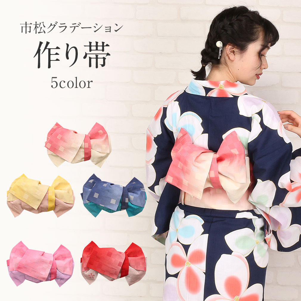 | 柔らかな色合いのグラデーション市松柄の帯を作り帯として仕立てました。 帯結びが苦手な方でも簡単に可愛く浴衣姿が決まりますよ。 タレのある変わりリボン結びでお洒落なデザイン。 ちょっと差をつける大人カワイイ作り帯で夏の浴衣の楽しみませんか? 素材はポリエステル100%ですので汚れても安心。 お手入れ簡単で気軽にお出かけを楽しめちゃいます。 着用方法もとてもシンプル。前帯を結び、差し込むだけで着付けが完了するので、着崩れの心配がありません。 座ったり運転時など必要に応じて着脱可能です。 気軽にお出掛けを楽しみたい方にオススメの商品です。 ⇒同じ柄の半幅帯はコチラから |