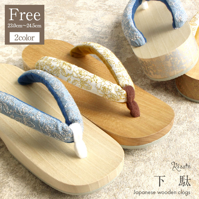 鼻緒のバラ刺繍や踵のプリントが目を引くこの下駄は、ブルーとイエローの2種類の中からお選びいただけます。