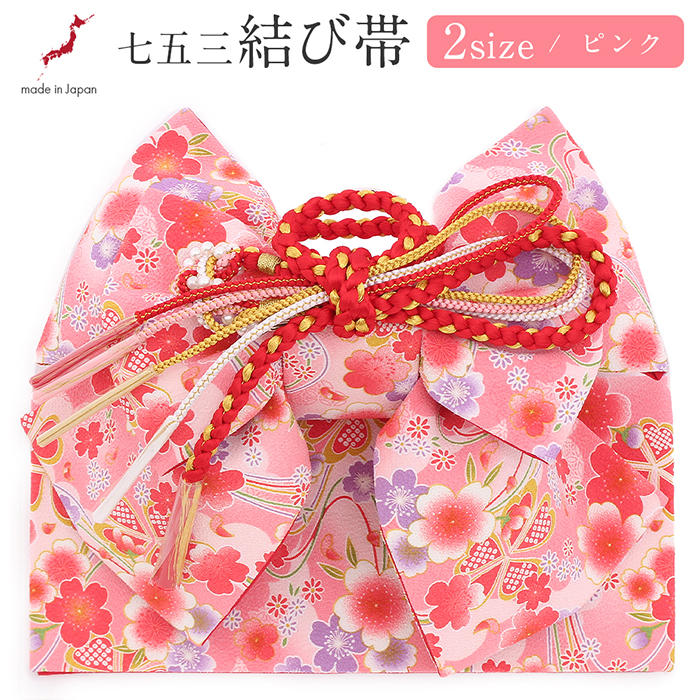 | お子さんの健やかな成長を祝う、七五三にピッタリの結び帯です。 半幅を巻いた上に、結び帯を上から差込むだけで簡単に出来上がり。 すでに帯の形が作られているので、着崩れの心配もなくお子様に安心して締められます。 ピンク色の縮緬生地に桜や小花が散りばめられた可愛らしい雰囲気。 光沢のある華やかな組紐飾りは、パール飾りや動くたびに揺れる房がアクセントに。 紐飾りは、取り外しができるので、アレンジを楽しむことができます。 大人に一歩近づく、一生に一度の大切なお祝い。 ぜひお気に入りの帯を締めて晴れの日をお迎えください。 |