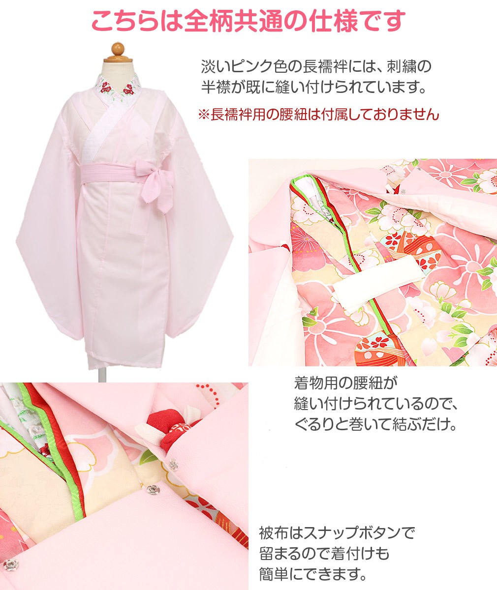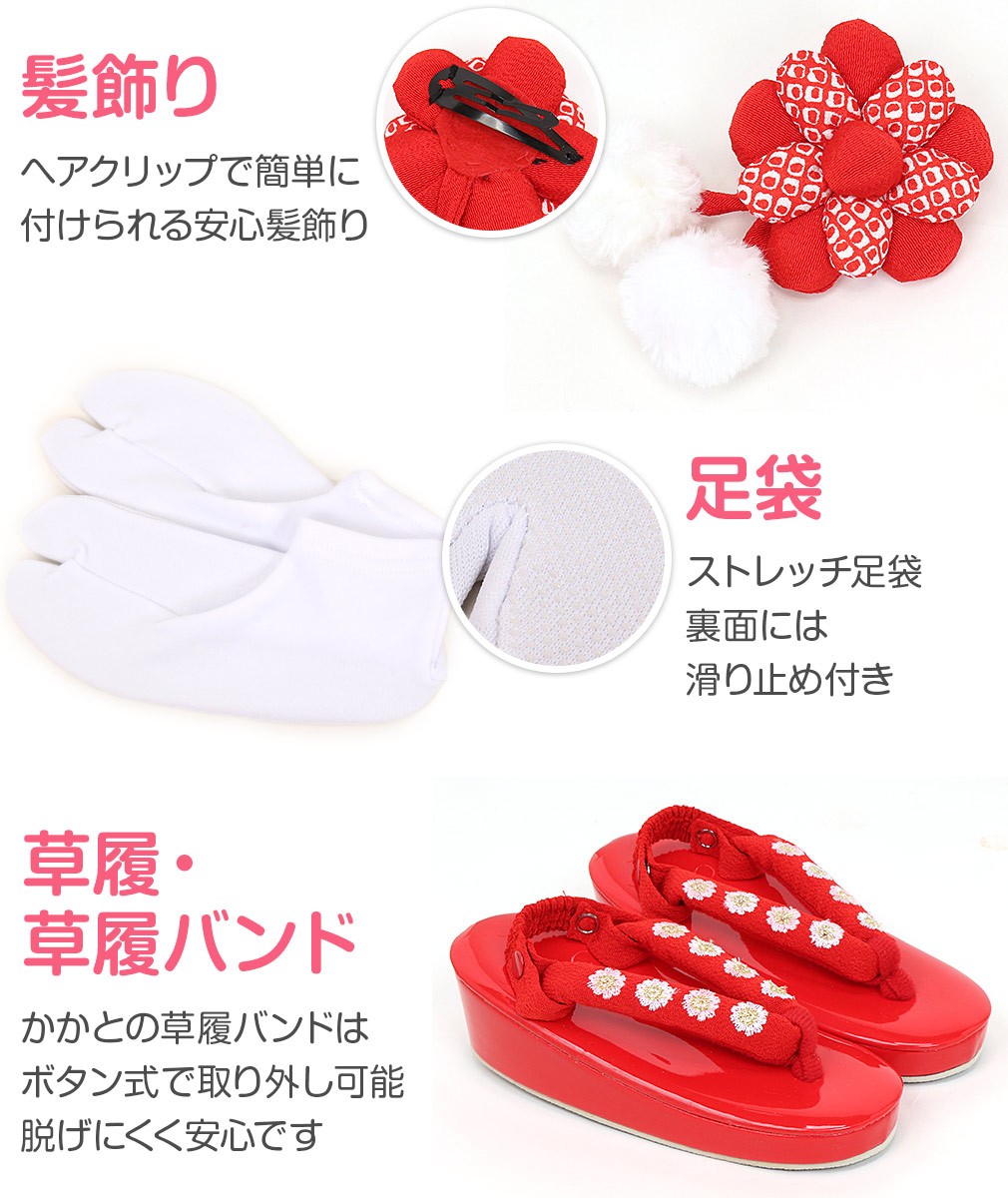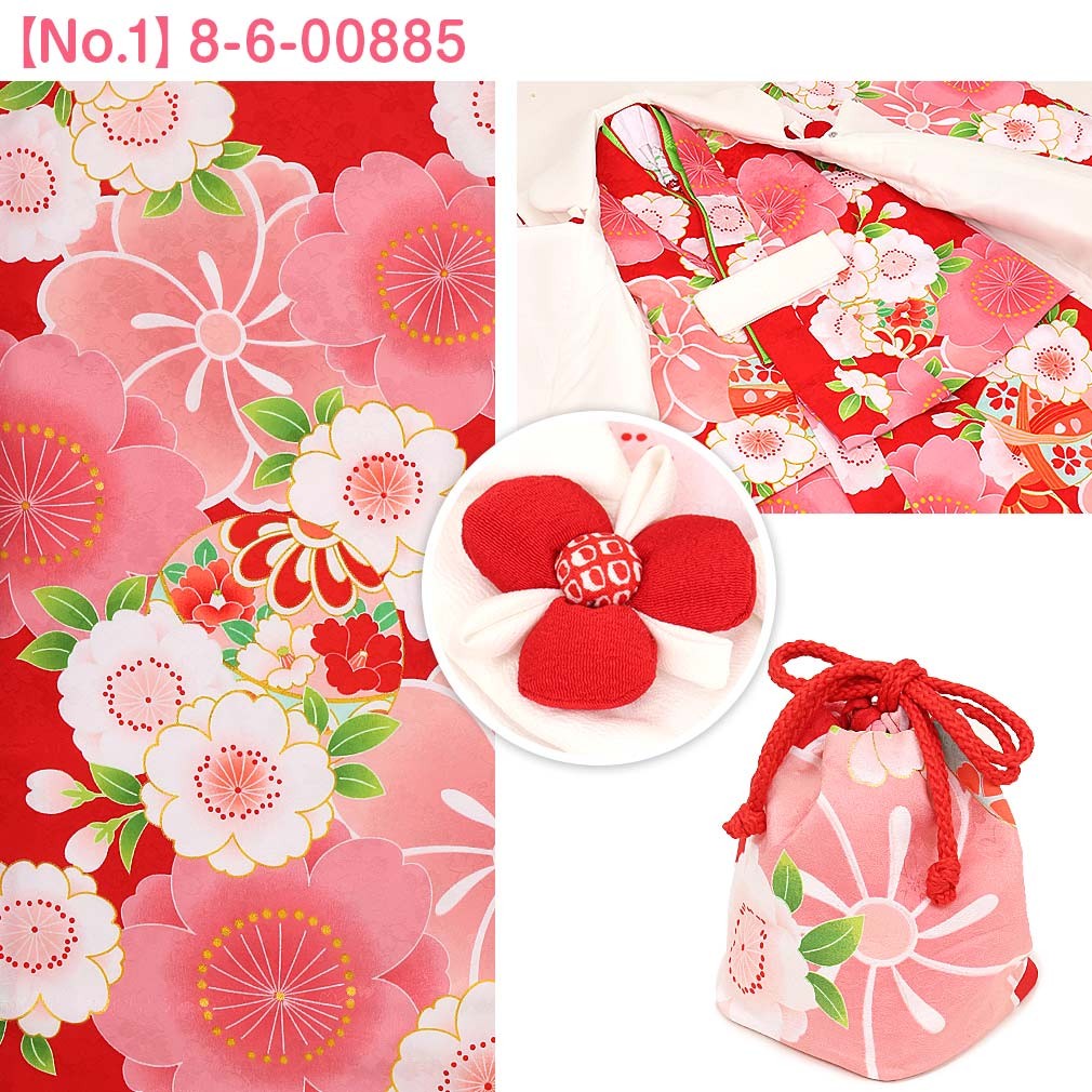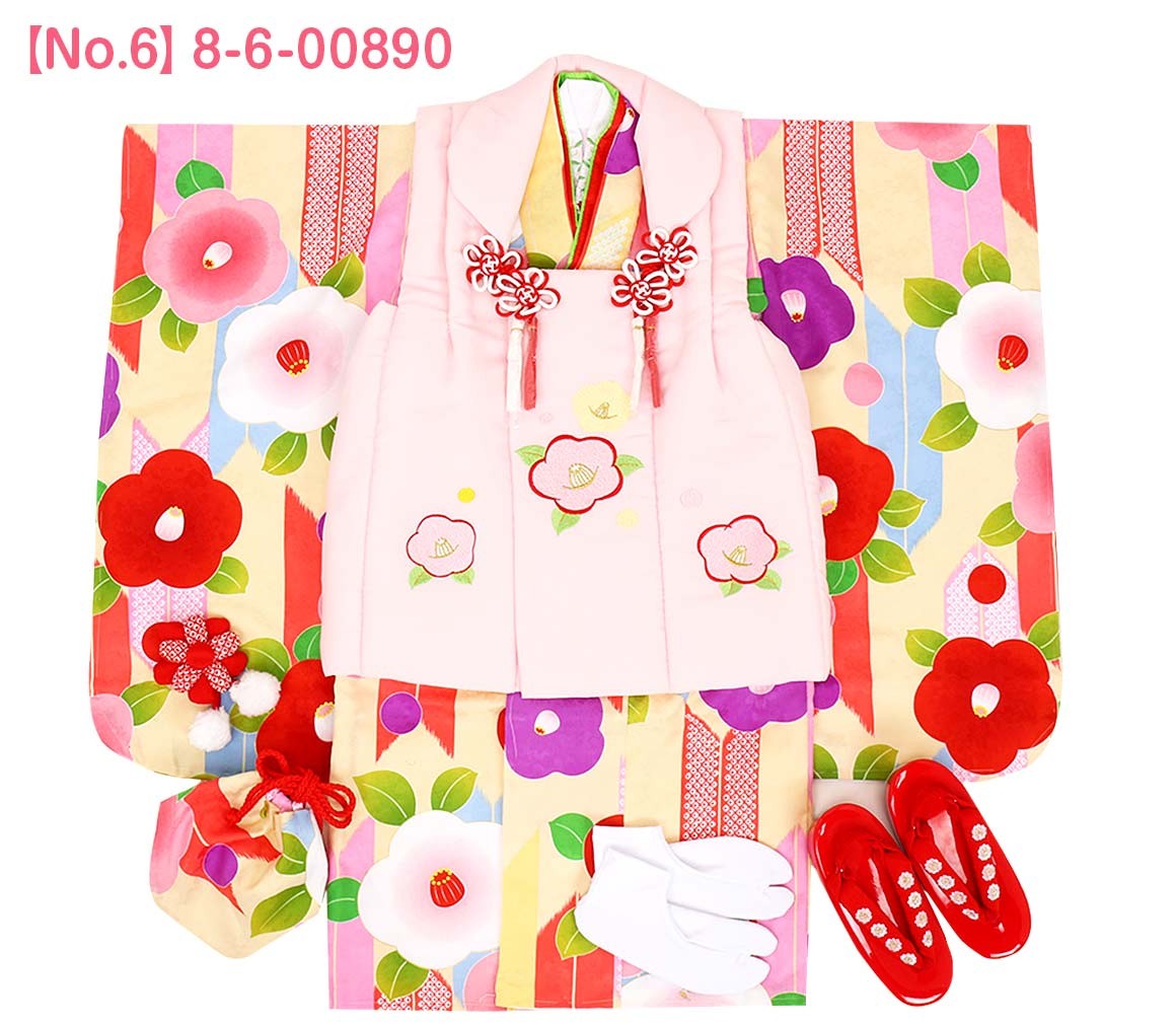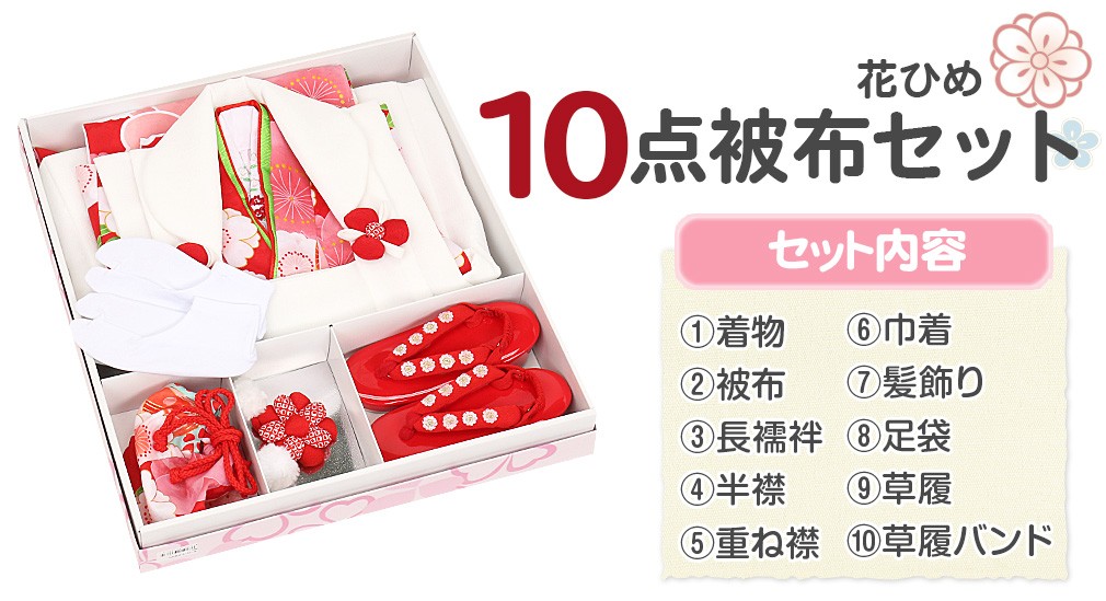 1.着物(腰ひも付き)2.被布3.長襦袢(腰ひも無し)4.半衿5.重ね衿6.巾着7.髪飾り8.足袋9.草履10.草履バンド