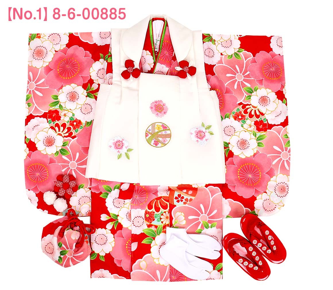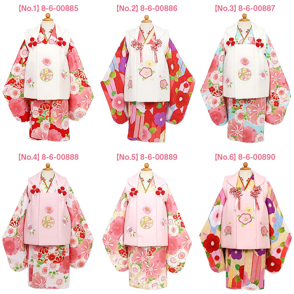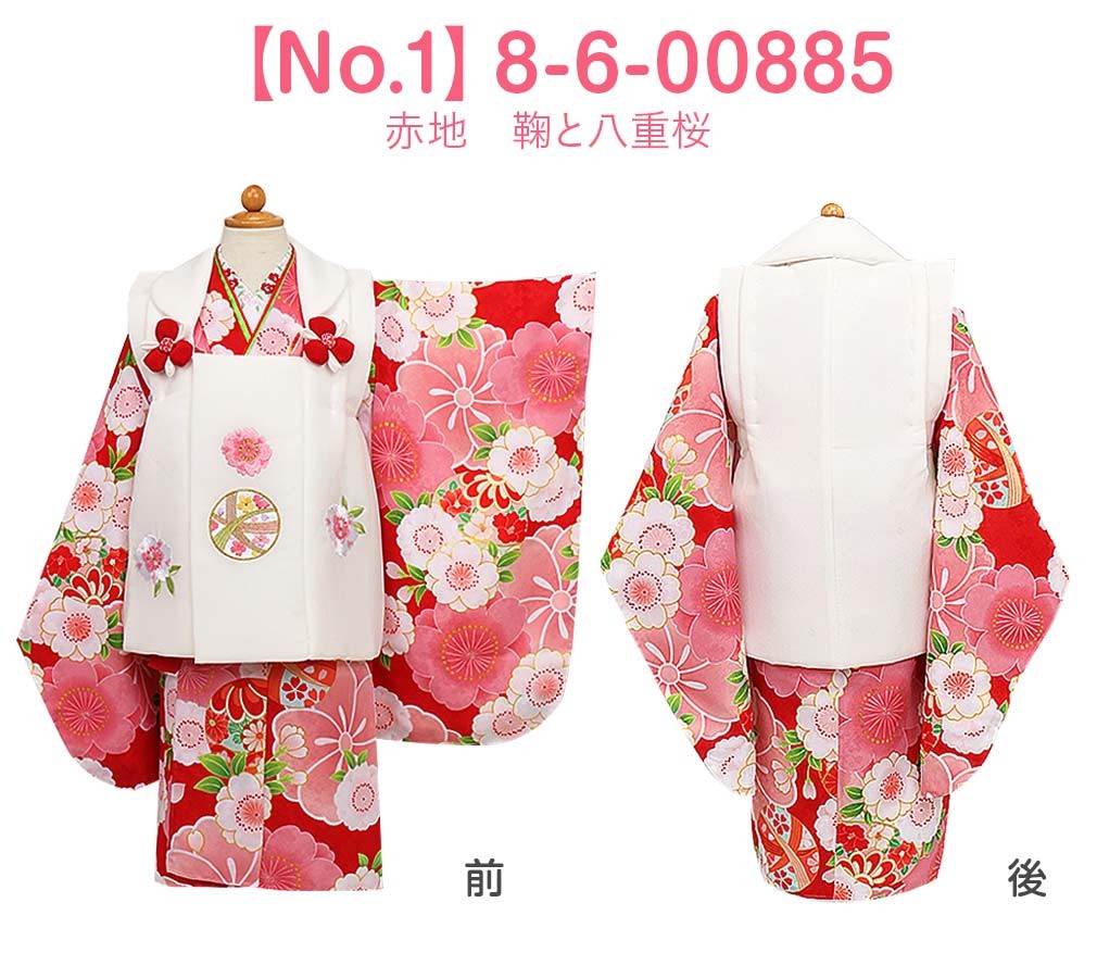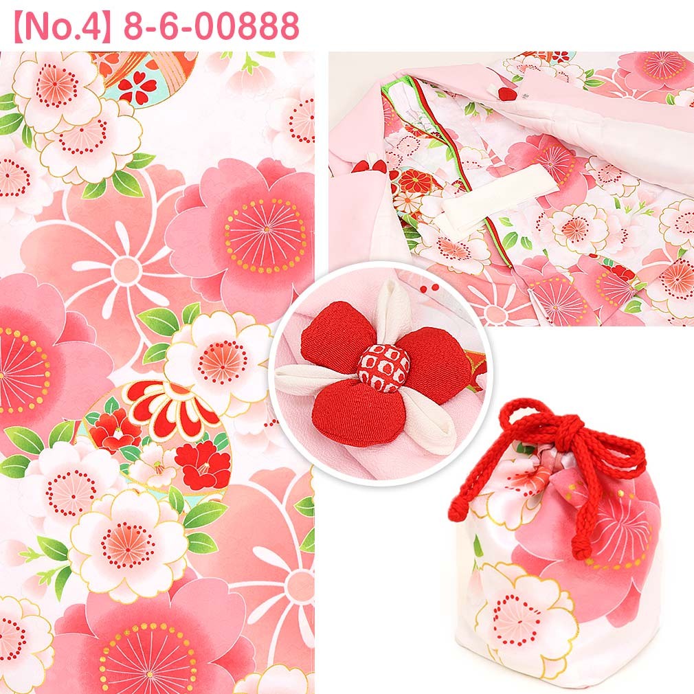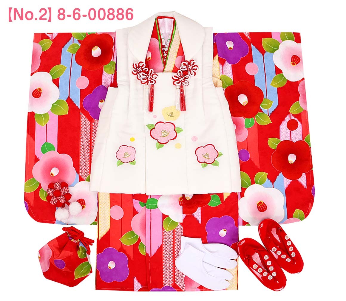 1.着物(腰ひも付き)2.被布3.長襦袢(腰ひも無し)4.半衿5.重ね衿6.巾着7.髪飾り8.足袋9.草履10.草履バンド