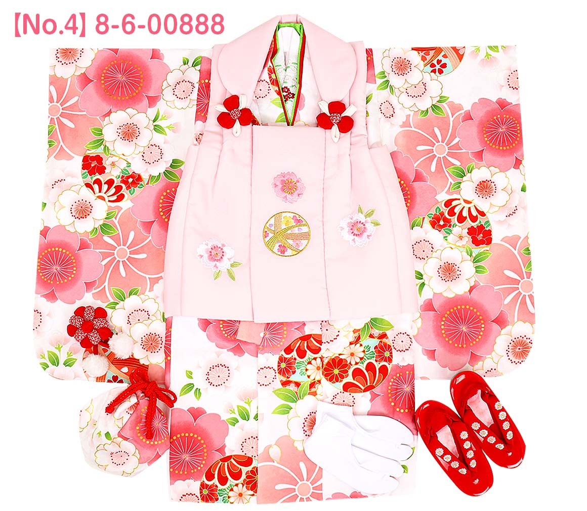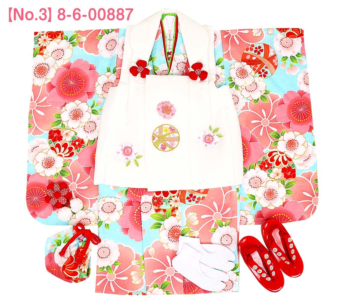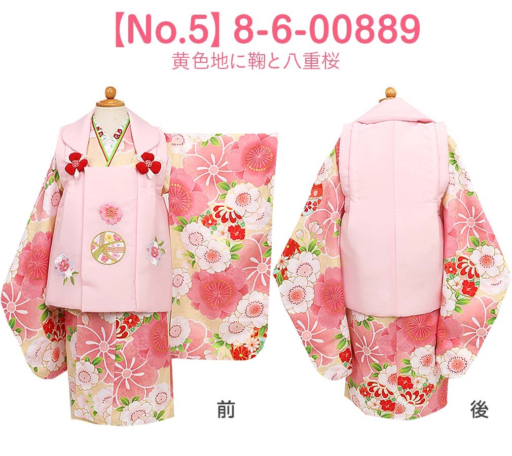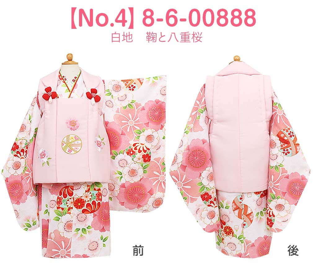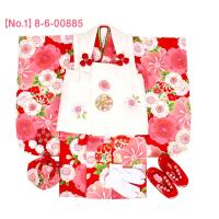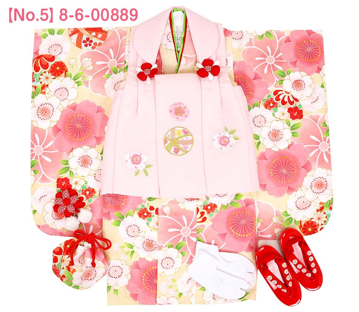 1.着物(腰ひも付き)2.被布3.長襦袢(腰ひも無し)4.半衿5.重ね衿6.巾着7.髪飾り8.足袋9.草履10.草履バンド