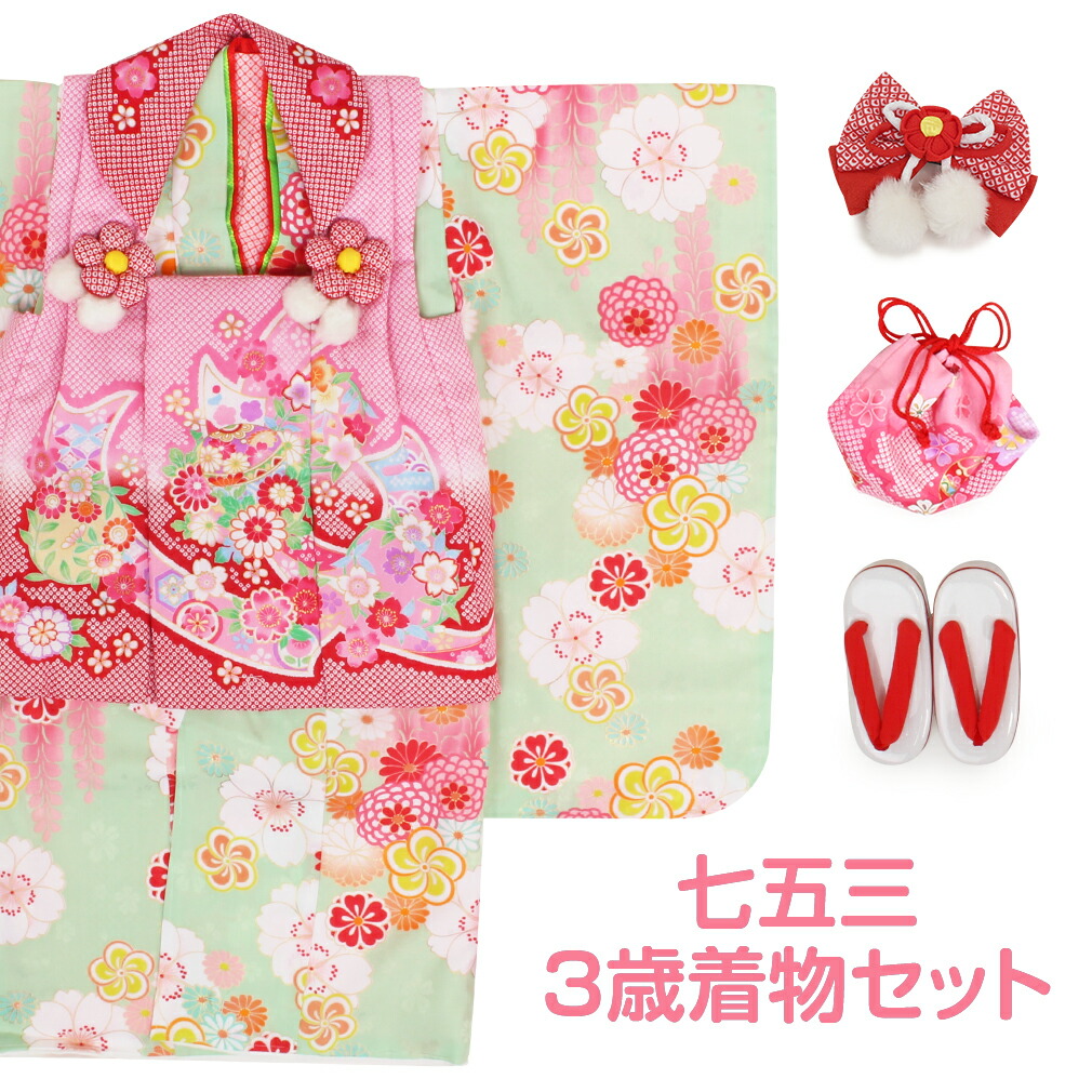 七五三のお祝いを素敵に、可愛く。 3歳の晴れ着をコーディネートした被布7点セットです。 一生に一度の大切な思い出だからこそ、他の子と被らない可愛らしい着物を。