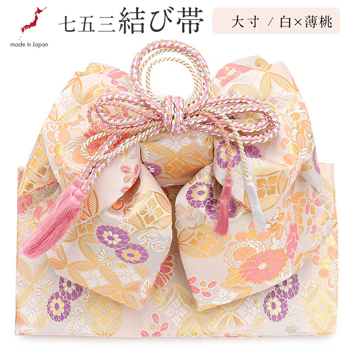 お嬢様の門出を祝うのにふさわしい、七五三にピッタリの結び帯です。 半幅を巻いた上に、結び帯を上から差込むだけで簡単に出来上がり。 すでに帯の形が作られているので、着崩れの心配もなくお子様に安心して締められます。