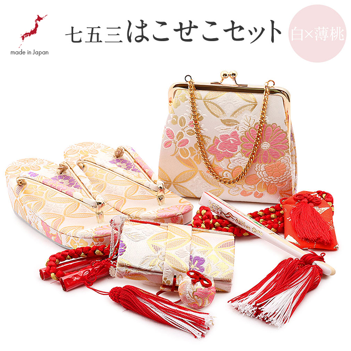 七五三のお祝いに欠かせないハコセコ、草履、バッグなど必要な小物が7点揃ったセットです。 可愛らしい色使いで、晴れ姿をより一層華やかに。