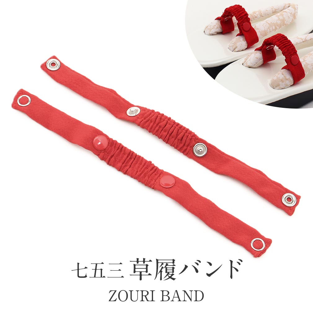 | 七五三着物・子供浴衣などを着る時の小さなお子様用の草履バンドです。 お手持ちの草履・下駄にボタンで留めるだけで、かかとをサポートしてくれるので、歩きやすくなります。 草履の脱げ防止になり、履きなれない草履もこのバンドがあれば安心です。 取り外しが簡単なスナップボタン式。草履に馴染みやすい、ちりめん生地仕立てです。 |