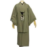 メンズ 着物 アンサンブル 羽織 着物セット 草色 無地 紬風 Mサイズ 男性 紳士 洗える着物 和服 和装