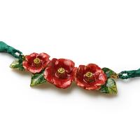 | 鮮やかな赤色の三輪の椿花がデザインされた羽織紐です。花の中心にはキラキラ輝くラインストーンが使用され、上品で少し華やかな雰囲気に。 |