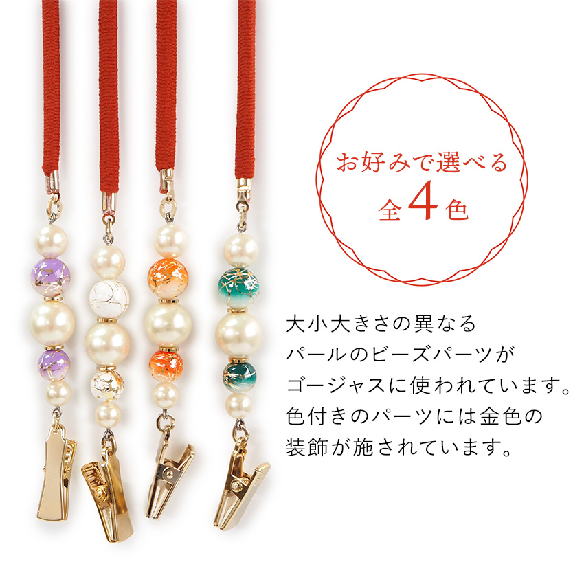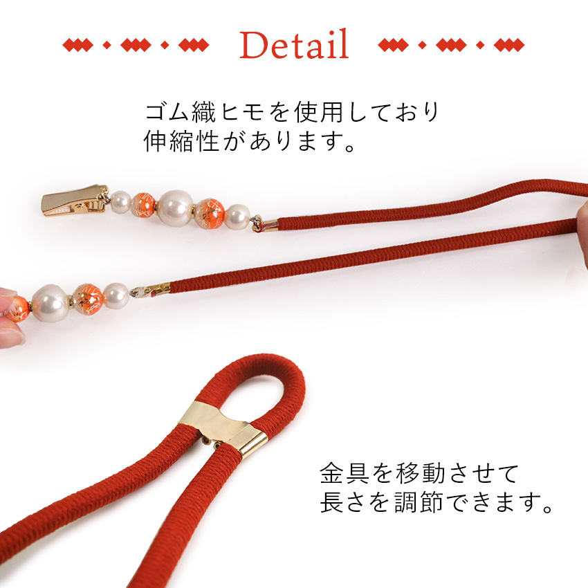 | 帯のお太鼓に通し、袂の両脇を先端のクリップで挟みます。 お炊事や作業をするときにチラチラと動く袂が揺れにくく、 汚れの心配も軽減してくれます。 他にも首からかけてハンカチを止めれば、エプロンのようにお使いいただけます。 |