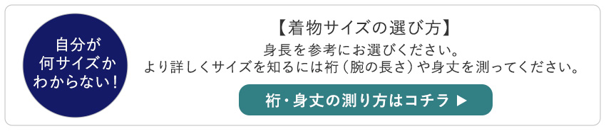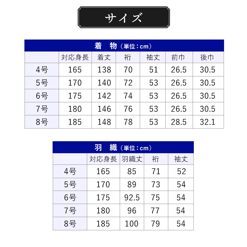 | ●4号<対応身長:165cm> 【着物】 着丈:138cm(3尺6寸5分)、裄:70cm(1尺8寸5分)、袖丈:51cm(1尺3寸5分)、前巾:26.5cm(7寸0分)、後巾:30.5cm(8寸0分) 【羽織】 羽織丈:85cm(2尺2寸5分)、裄:71cm(1尺8寸7分)、袖丈:52cm(1尺3寸7分)) ●5号<対応身長:170cm> 【着物】 着丈:140cm(3尺7寸0分)、裄:72cm(1尺9寸0分)、袖丈:53cm(1尺4寸0分)、前巾:26.5cm(7寸0分)、後巾:30.5cm(8寸0分) 【羽織】 羽織丈:89cm(2尺3寸5分)、裄:73cm(1尺9寸2分)、袖丈:54cm(1尺4寸2分) ●6号<対応身長:175cm> 【着物】 着丈:142cm(3尺8寸0分)、裄:74cm(1尺9寸5分)、袖丈:53cm(1尺4寸0分)、前巾:26.5cm(7寸0分)、後巾:30.5cm(8寸0分) 【羽織】 羽織丈:92.5cm(2尺4寸4分)、裄:75cm(1尺9寸7分)、袖丈:54cm(1尺4寸2分) ●7号<対応身長:180cm> 【着物】 着丈:146cm(3尺8寸5分)、裄:76cm(2尺0寸0分)、袖丈:53cm(1尺4寸0分)、前巾:26.5cm(7寸0分)、後巾:30.5cm(8寸0分) 【羽織】 羽織丈:96cm(2尺5寸3分)、裄:77cm(2尺0寸2分)、袖丈:54cm(1尺4寸2分) ●8号<対応身長:185cm> 【着物】 着丈:148cm(3尺9寸0分)、裄:78cm(2尺0寸5分)、袖丈:53cm(1尺4寸0分)、前巾:28.5cm(7寸5分)、後巾:32.1cm(8寸5分) 【羽織】 羽織丈:100cm(2尺6寸4分)、裄:79cm(2尺0寸7分)、袖丈:54cm(1尺4寸2分) |