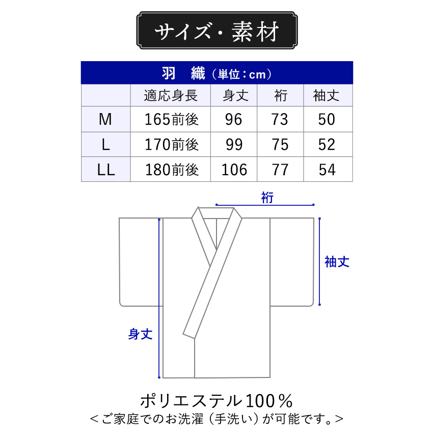 | ●Mサイズ<対応身長:165cm前後> 身丈:96cm、裄:73cm、袖丈:50cm ●Lサイズ<対応身長:170m前後> 身丈:99cm、裄:75cm、袖丈:52cm ●LLイズ<対応身長:180cm前後> 身丈:106cm、裄:77cm、袖丈:54cm |