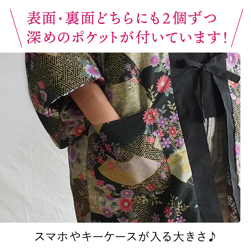 | フリーサイズ バスト:約79〜94cm 対応身長:約154〜162cm 身丈:約80cm、肩幅:約33cm、袖幅:約30cm 袖丈:約32cm、袖口:約20cm ポケット:横 約16cm×縦 約17cm 重さ:約400g |