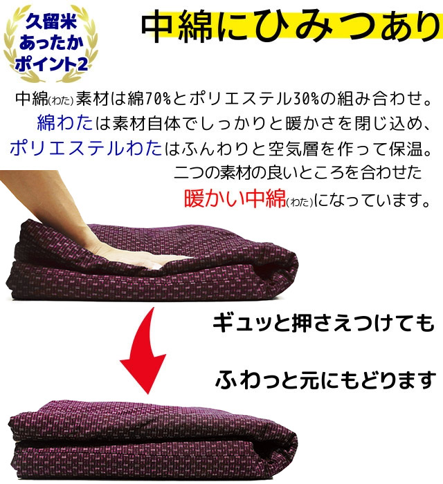 中わたの”へたり”を防止するため、ポリエステルを混ぜてふっくらに仕上げています。