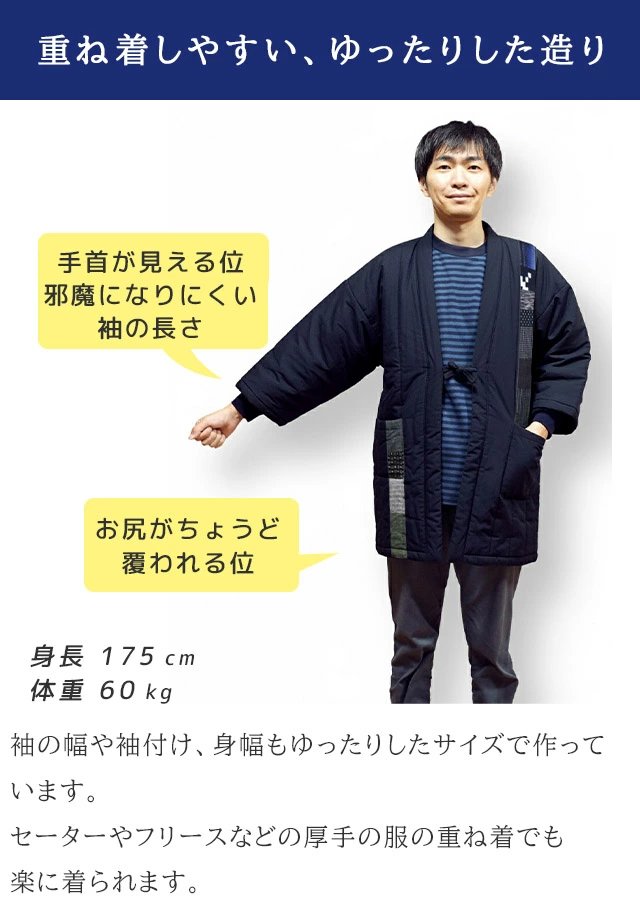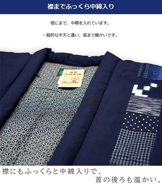 一般的なポリエステル100%の中わた入り半天より暖かく過ごしていただけます。