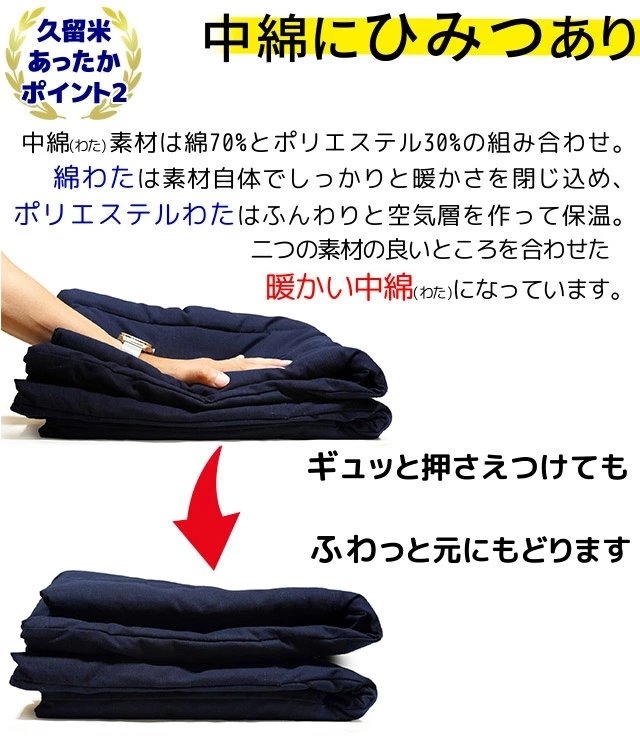 中わたには、保温性の高い、綿とポリエステルの混合わたを使用!
