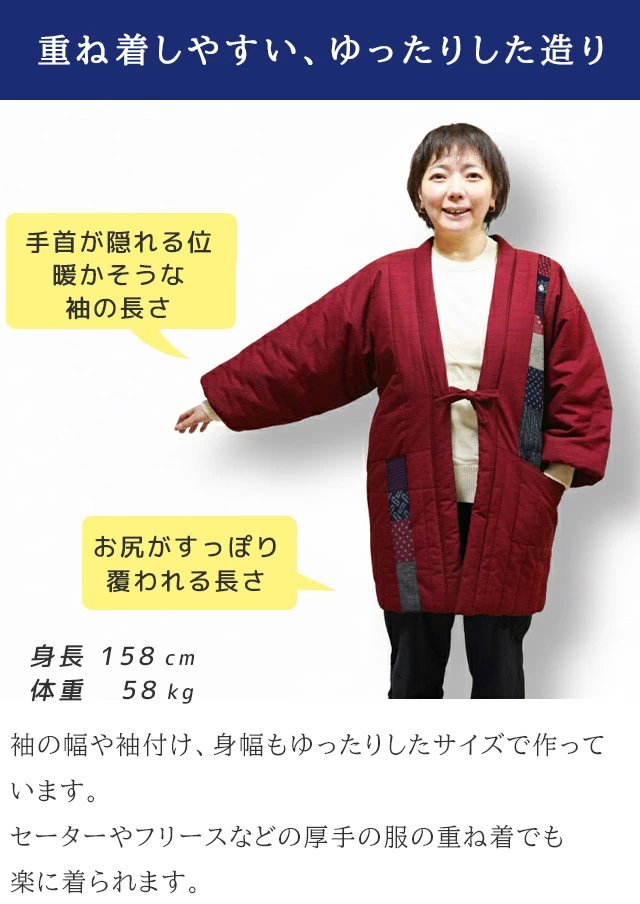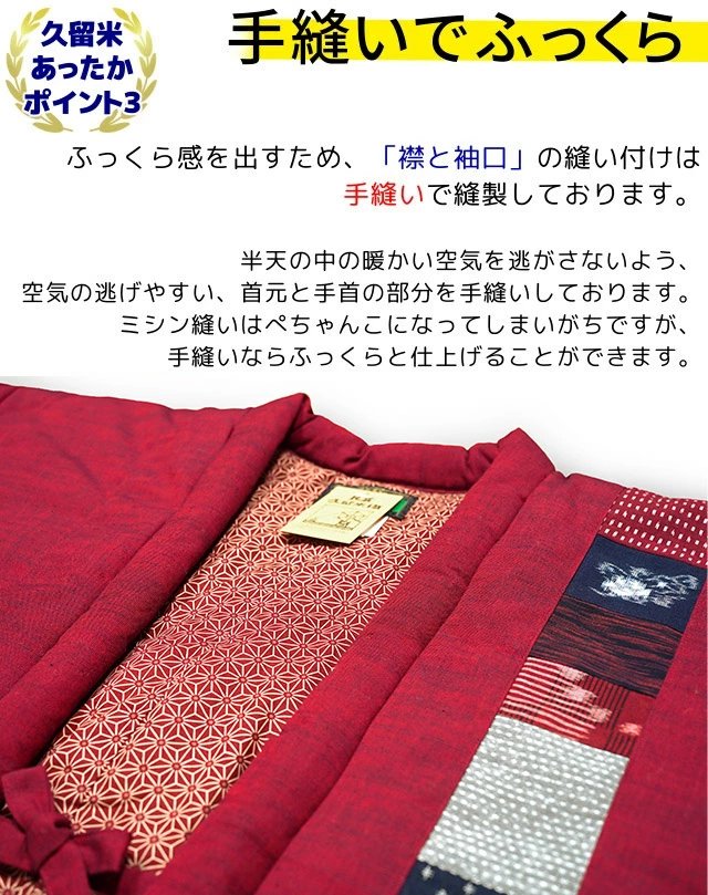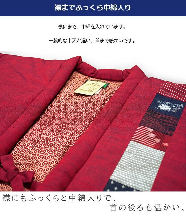 一般的なポリエステル100%の中わた入り半天より暖かく過ごしていただけます。