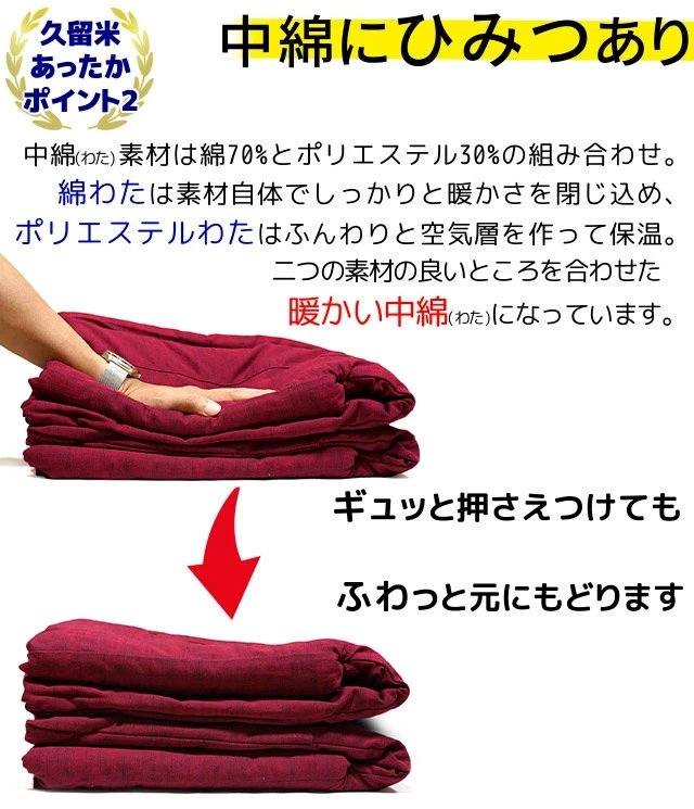 中わたの”へたり”を防止するため、ポリエステルを混ぜてふっくらに仕上げています。