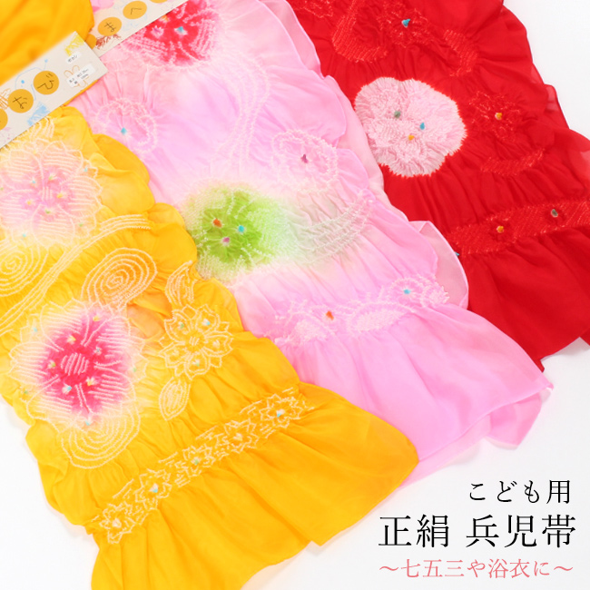 浴衣 帯 子供 兵児帯 七五三 ゆかた帯 正絹 絞り入り パールトーン加工済み 赤 黄色 ピンク