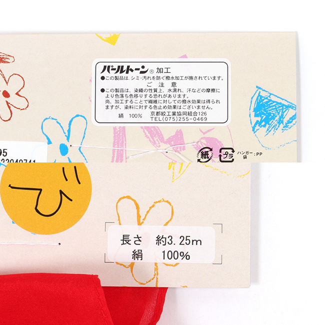 こちらの兵児帯には、水や油をはじき、シミ汚れを防ぐガード加工「パールトーン加工」が施されています。汚れた場合には、ティッシュや布などで吸い取るように拭くだけでOKなので、お母さまも安心です。