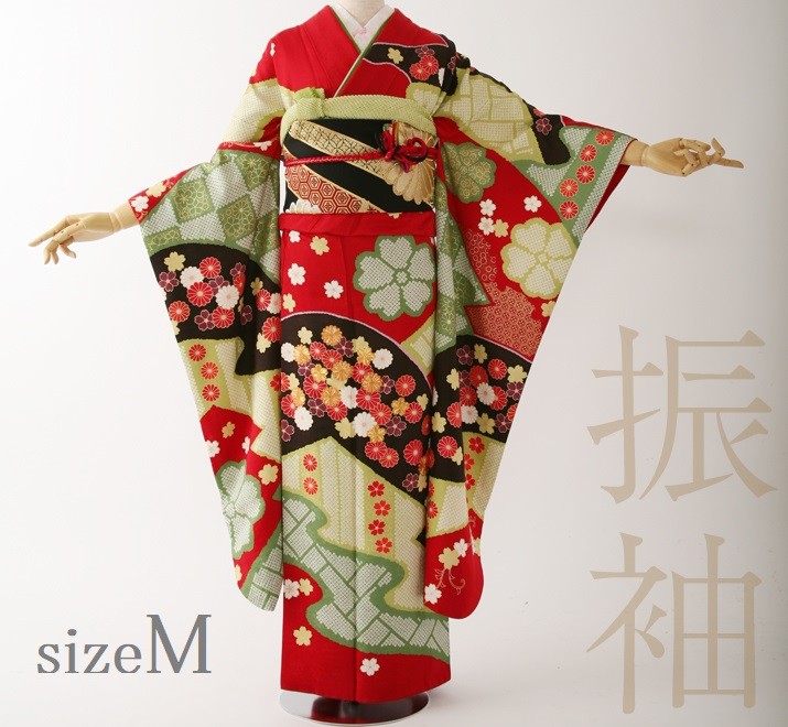 振袖レンタル19点フルセット【Mサイズ/赤/菊の花 青柳】足袋プレゼント 成人式 結婚式 お茶会 結納 振袖 着物レンタル 貸衣装