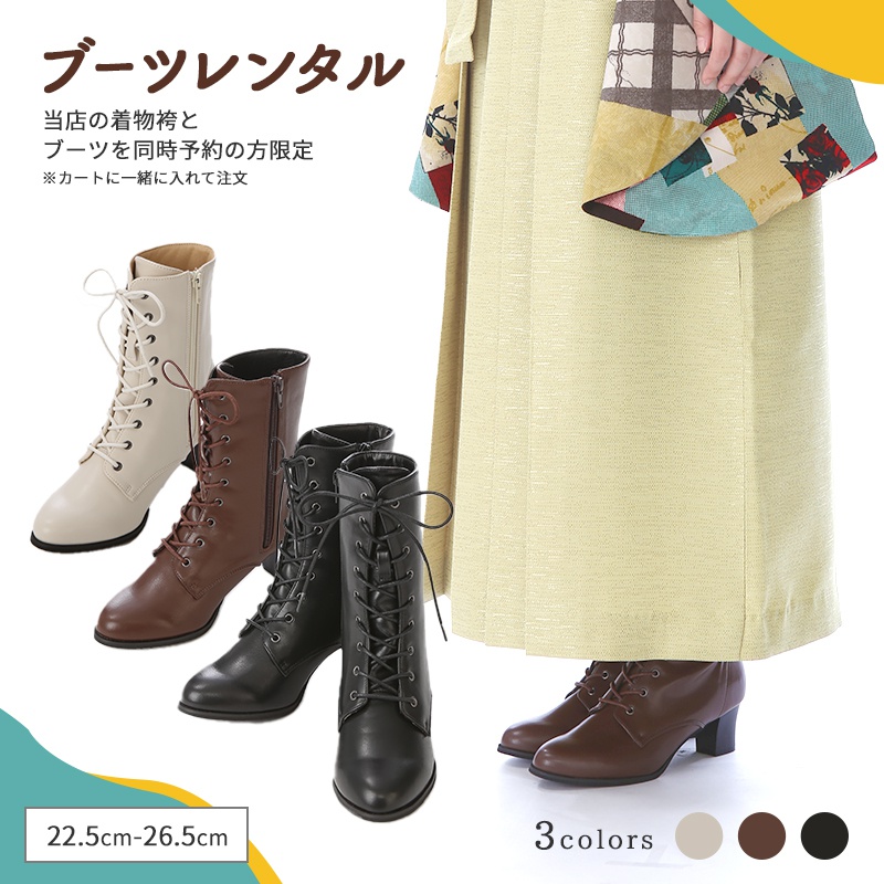 | 注意事項4 | ブーツのみのご注文はお受けできません。 当店にて卒業袴のみをすでにご注文済みで、後からブーツをご追加したい場合は、卒業袴の注文後に届いている確定メールからご返信してご依頼ください。その際は「サイズ・カラー」をご記入してください。 ※ブーツのみのご注文はキャンセル処理となります。 卒業袴の発送後にブーツの追加はできません。 |
