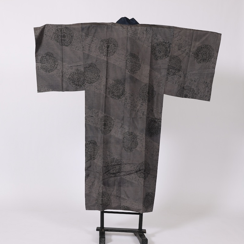 茶系のオシャレなお色にモダンな鏡柄を染めあげたお品になります。