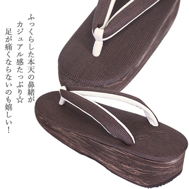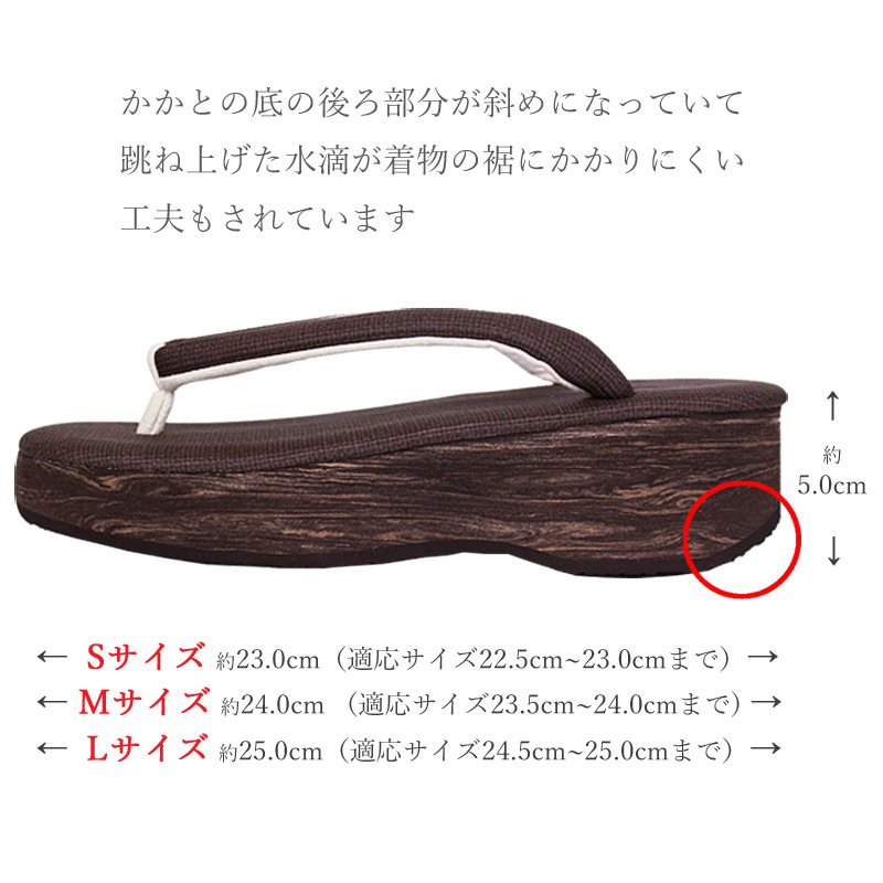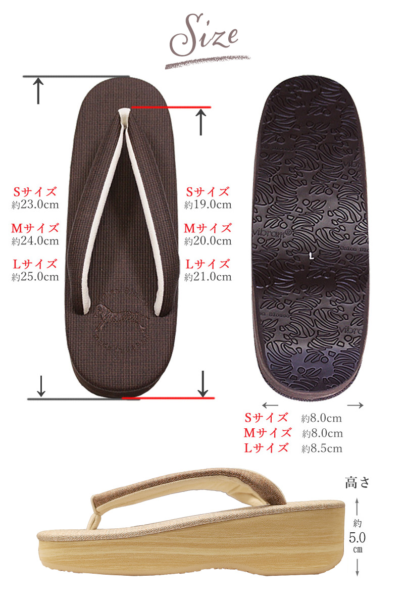 菱屋(ひしや)謹製の大人気カフェぞうりシリーズが入荷いたしました。洗える着物(ポリエステルの小紋)や、木綿の着物・ウール着物などのカジュアルな普段着物にぴったりの、『カレンブロッソ』ブランドの草履です♪ふっくらとした鼻緒がすげられているので、足の指が痛くなりにくいんですよ!また、特殊スポンジを使った草履の台が、ちょうど良いクッションになっていますので、履き心地も良く、疲れにくいですよ。■サイズ・Sサイズ 台の長さ:約23.0cm 台の幅:約7.7cm 台の高さ:約5.0cm 適応サイズ:22.0cm〜23.0cmくらい・Mサイズ 台の長さ;約24.0cm 台の幅;約8.0cm 台の高さ;約5.0cm 適応サイズ:23.0cm〜24.0cmくらい・Lサイズ 台の長さ;約25.0cm 台の幅;約8.5cm 台の高さ;約5.0cm 適応サイズ:24.0cm〜25.0cmくらい※こちらの草履は、底材を貼り合わせているため、鼻緒のすげ替えやゆるみの調整はできません。ご了承下さいませ。■品質表示【日本製】鼻緒天の素材:ポリ塩化ビニール鼻緒裏素材:ポリエステル先坪の素材:ポリウレタン台の素材:EVA底の形状:ビブラム・ソール(R)また、こちらは使いやすい無地の台と鼻緒ですので、着物コーディネートの際に、ついつい手が伸びてしまう履き物ですよ☆そして、お洋服(ジーンズ姿にも☆)の時にもお楽しみ頂けるくらい、和洋折衷のデザインも魅力の一つです。