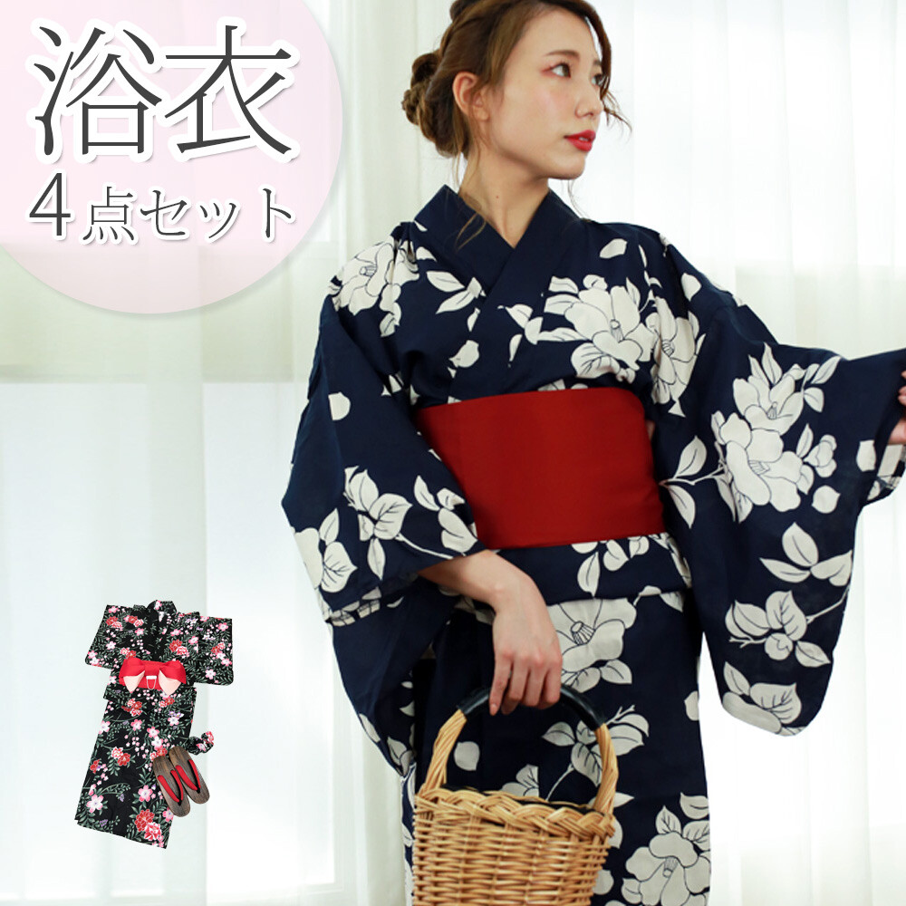 浴衣 【単品】【4点セット】 (結び帯+下駄+シュシュ) ブラック レッド 着丈163cm 裄丈67cm 袖丈:49cm 夏祭り 花火大会 おしゃれ 簡単 黒 透けない