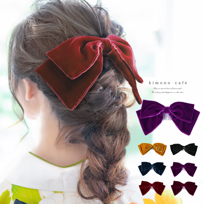 高品質なベルベットブランド、アゲハラの生地を使ったリボンの髪飾りです。ふっくらとした質感、クラシックで上品な見た目は、卒業式などで着られる袴姿にぴったりです。