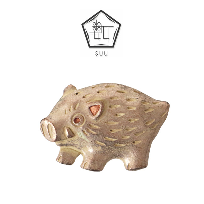 繊細で可愛いデザインが人気の[数 SUU]の帯留です。ころんとした形が可愛いイノシシの帯留です。なんとなく幼い表情に見えるので勝手にウリ坊かな?と思っていますが、どうなんでしょう。優しいブロンズ色で、洋風にも和風にも合わせられる感じがします。