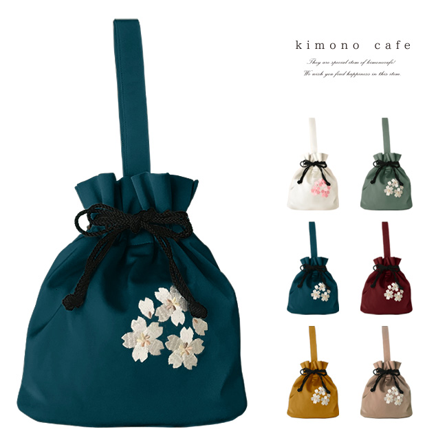 袴用巾着 桜刺繍 一本手 袴用バッグ 卒業式 小学生袴 白 エンジ 黄色 モスグリーン くすみカラー