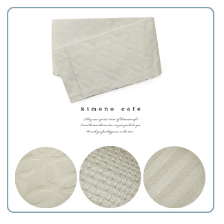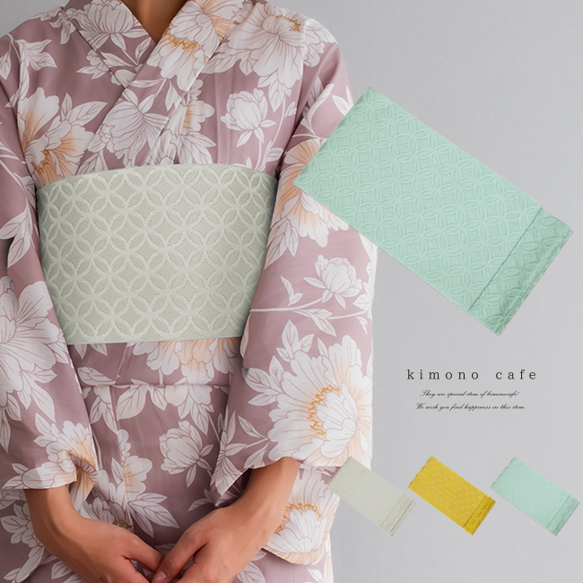 弊社の国内工場で織った日本製の半幅帯です。七宝柄が地模様として入っています。無地ですのでどんな浴衣ともマッチしやすく、使いやすい帯です。袴下帯としても使えます。