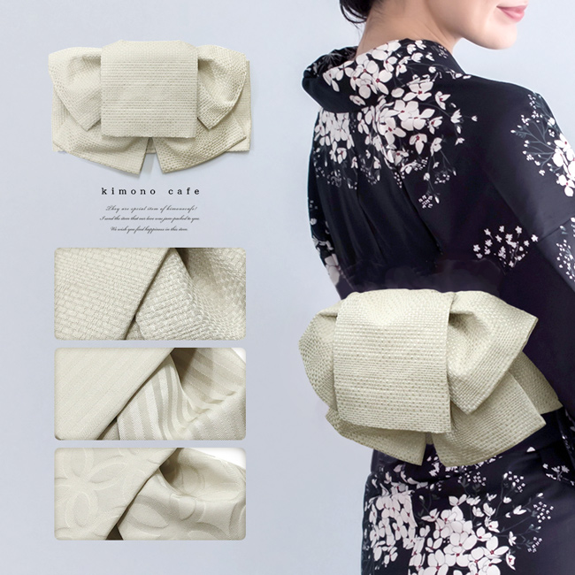 自社の国内工場で生地を織り、中国工場にて縫製を行っています。七宝柄、ストライプ柄、格子柄などの地模様が入ったシンプルな作り帯です。作り帯なので胴に巻くだけでOK!とっても簡単です。落ち着いたアイボリー色なのでどんな浴衣ともマッチしやすく使いやすいですよ。