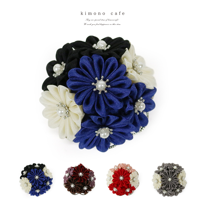 振袖の帯締めに付ける飾りです。小さなつまみ細工をドーム型に飾り付けた愛らしい帯飾りです。つまみ細工は絹(羽二重)で作っています。平締めはもちろん、組紐タイプにも引っ掛けることが可能です。ピンを併用すれば髪につけることも可能です。