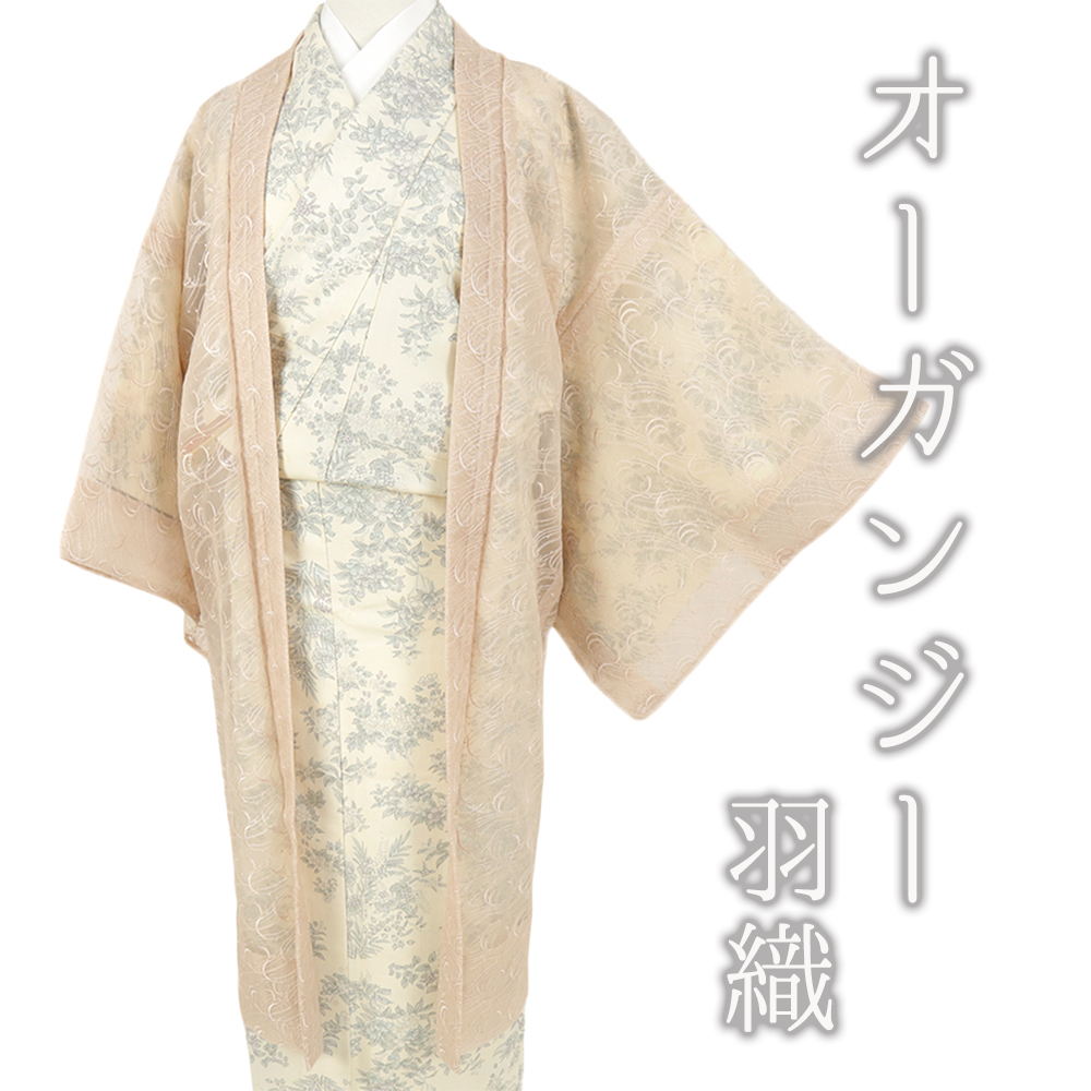 長羽織 ピンクベージュ レース オーガンジー 紋紗 塵除け 正絹 スリーシーズン 流水 月 お仕立て上がり 着物 春 夏 秋 No.3-1008