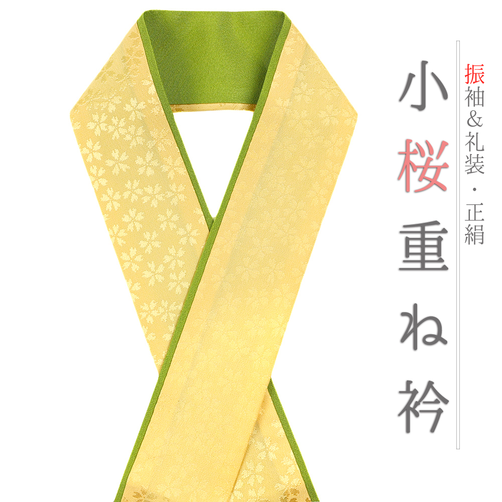 重ね衿 訪問着 伊達衿 正絹 黄色 緑 渋緑 花 桜 小花 襟ピン付き 礼装用 フォーマル 日本製 お洒落 可愛い ちりめん 訪問着 振 No.8-3155