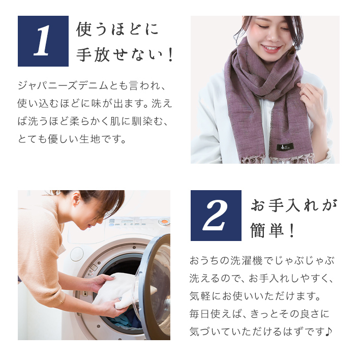 ジャパニーズデニムと言われ、使い込むほどに味となり、洗えば洗うほど柔らかく肌に馴染む、優しい生地です。