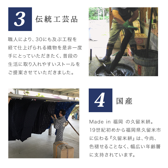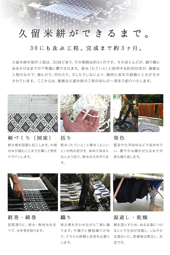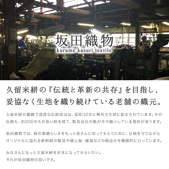 Made in 福岡の久留米絣。19世紀初めから福岡県久留米市に伝わる『久留米絣』は、今尚、色褪せることなく、幅広い年齢層に支持されています。