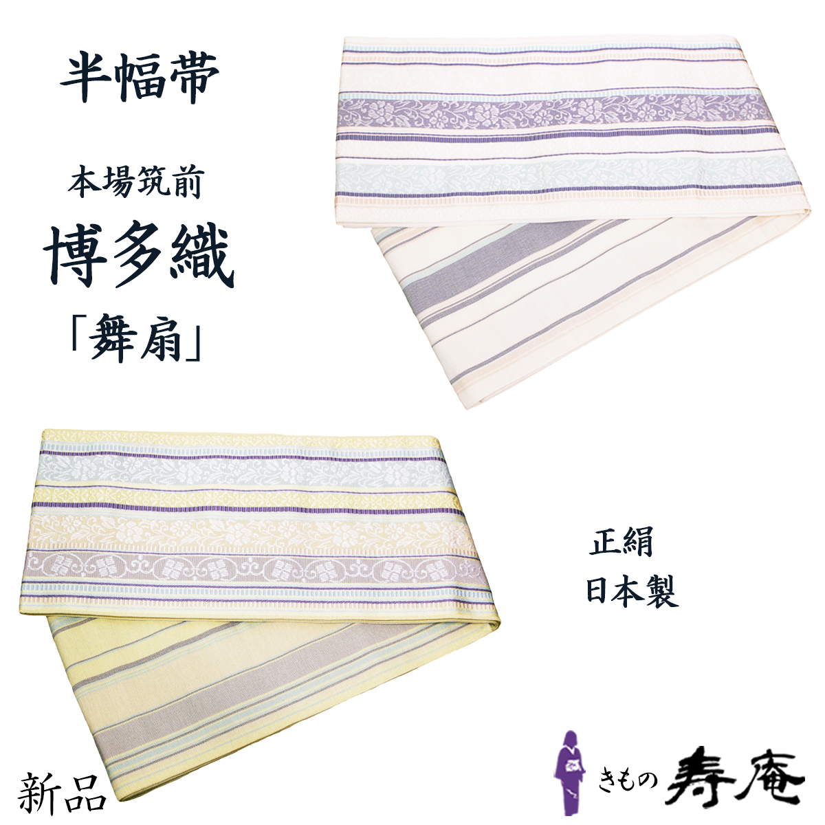 帯 半幅帯 正絹 博多 博多織 献上 四寸 約3.7m 本場筑前 舞扇 金証紙 小袋帯 花唐草間道 井上絹織株 小野和也謹製 金証紙 新品 日本製