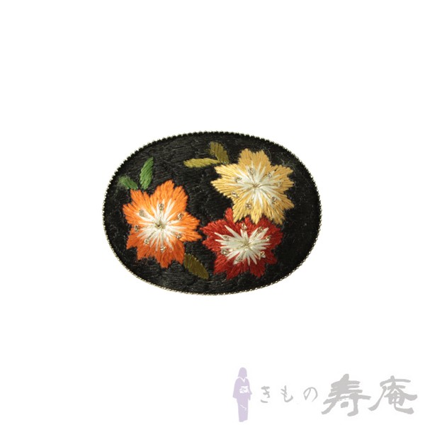 銀台に、黒の淵取りをし、紫色地に黄色・赤色の小花をデザイン。すべて刺繍で表現された可愛い帯留めです。