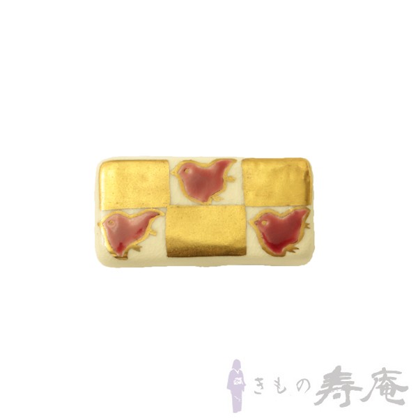 赤の千鳥と金色の市松柄帯留です。
